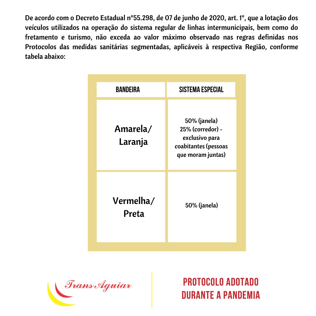 Nas regiões onde a bandeira é vermelha ou preta, no sistema de fretamento eventual e viagens de turismo , a capacidade fica restrita a 50% dos passageiros na janela.
